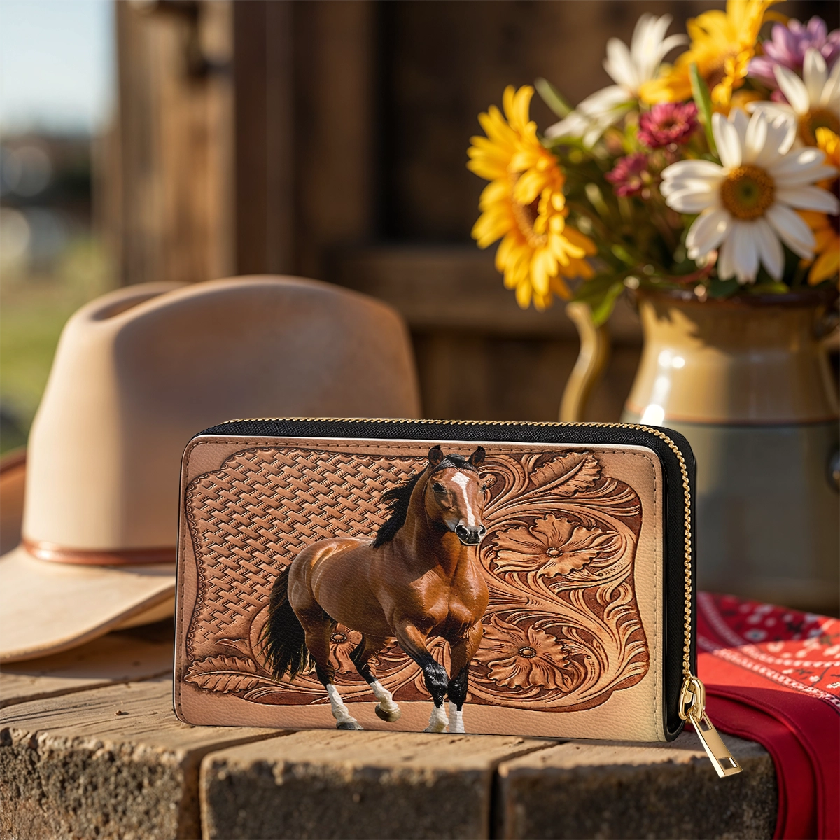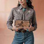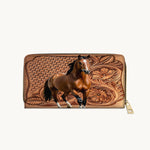 The Leather Horse Legacy wallet fuses power and tradition in a beautifully compact form. A strong bay horse stands proudly against a backdrop of carved leather florals and basket weave patterns - symbols of Western craftsmanship. Every detail echoes the legacy of saddle makers and the spirit of wild freedom. Made for women who walk with confidence and honor their roots. Carry strength and heritage, right in the palm of your hand.