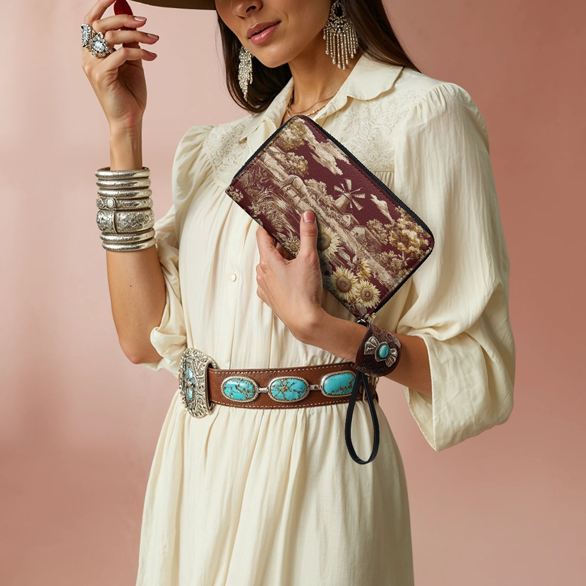 A sepia-tinted memory of the countryside unfolds across this piece — sunflowers blooming under wide skies, windmills turning in the hush of golden fields. This artwork captures the quiet romance of a Western morning, where strength lives in simplicity and beauty rises from the land we love.