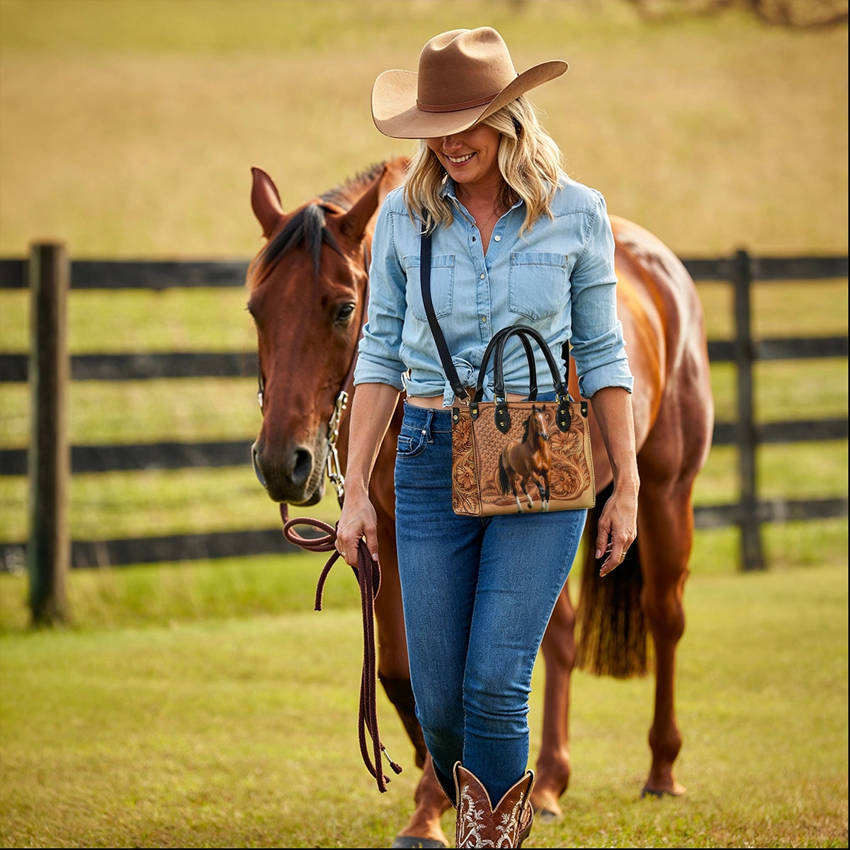 This bag features a high-quality printed design that mimics hand-tooled leather and a lifelike horse in motion.