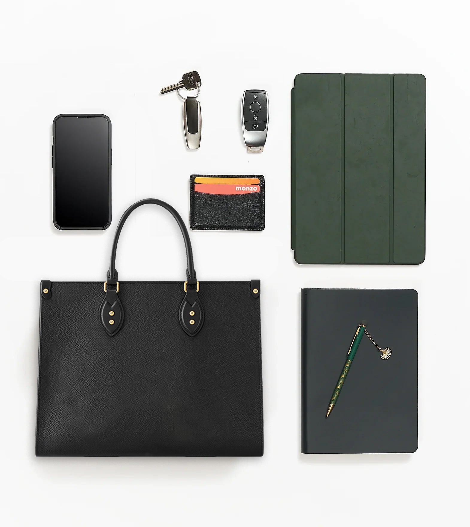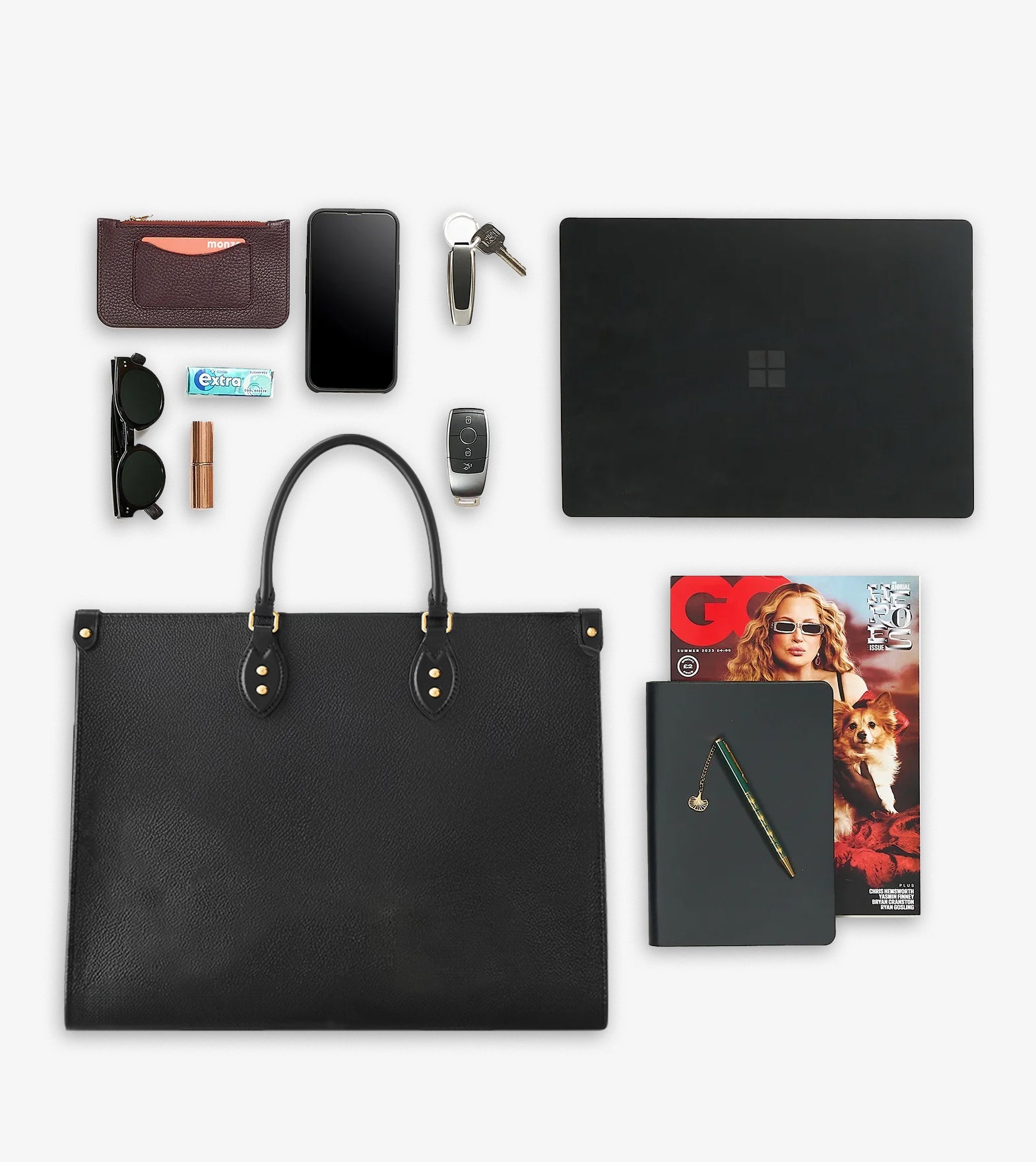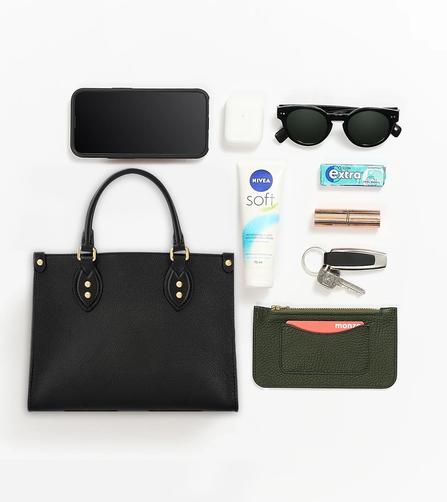 MEDIUM (13.8" x 10.6" x 5.5"): Our most balanced size — holds your tablet, a clutch wallet, keys, sunglasses, hand cream, and more. Ideal for workdays or busy weekends when you want space without bulk.