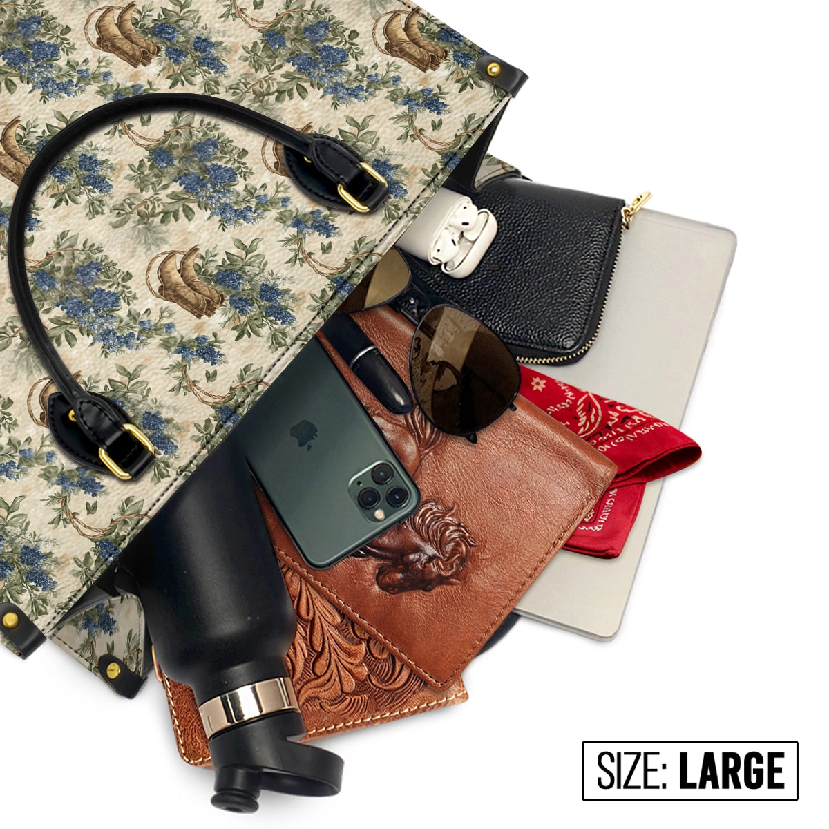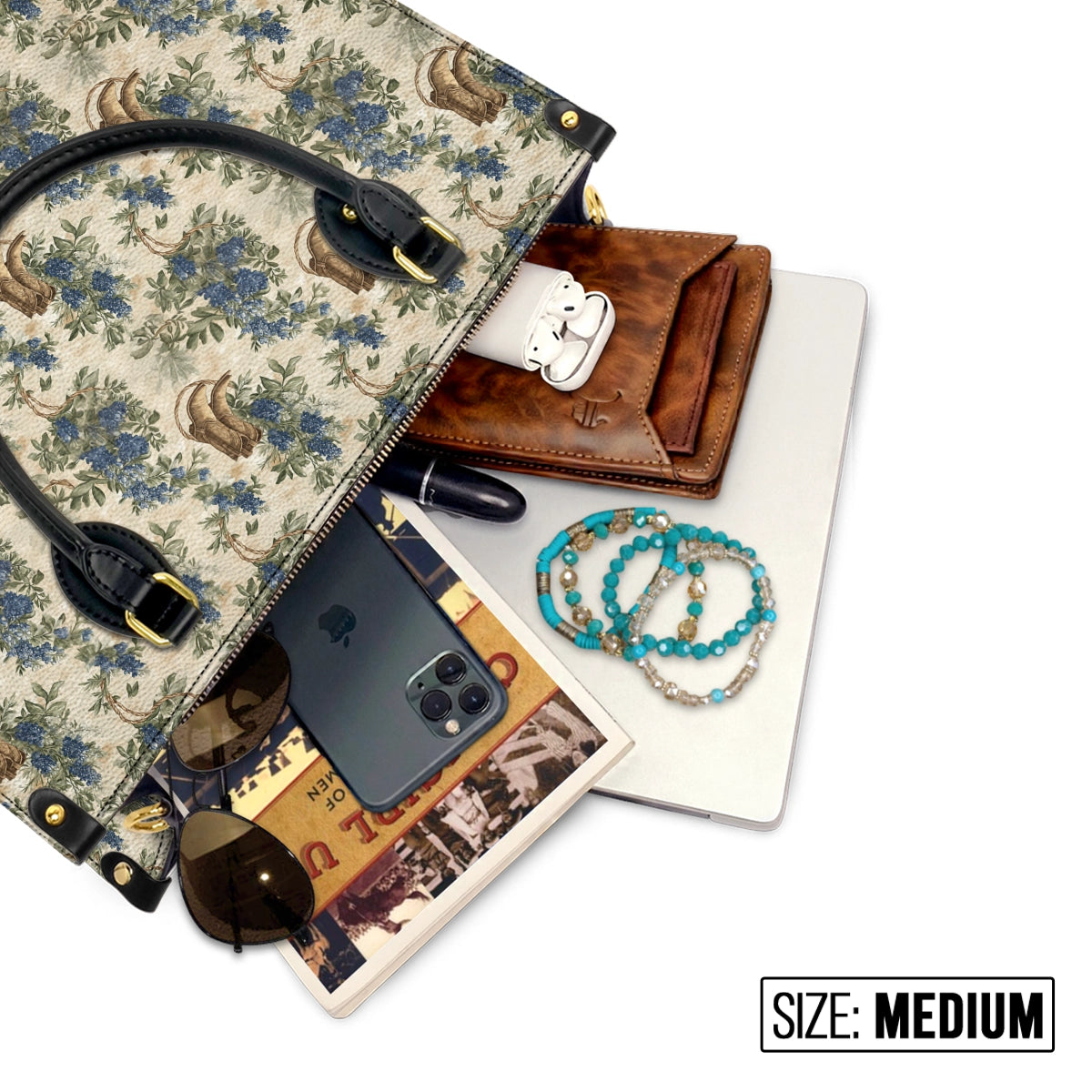 MEDIUM (13.8" x 10.6" x 5.5"): Our most balanced size — holds your tablet, a clutch wallet, keys, sunglasses, hand cream, and more. Ideal for workdays or busy weekends when you want space without bulk.