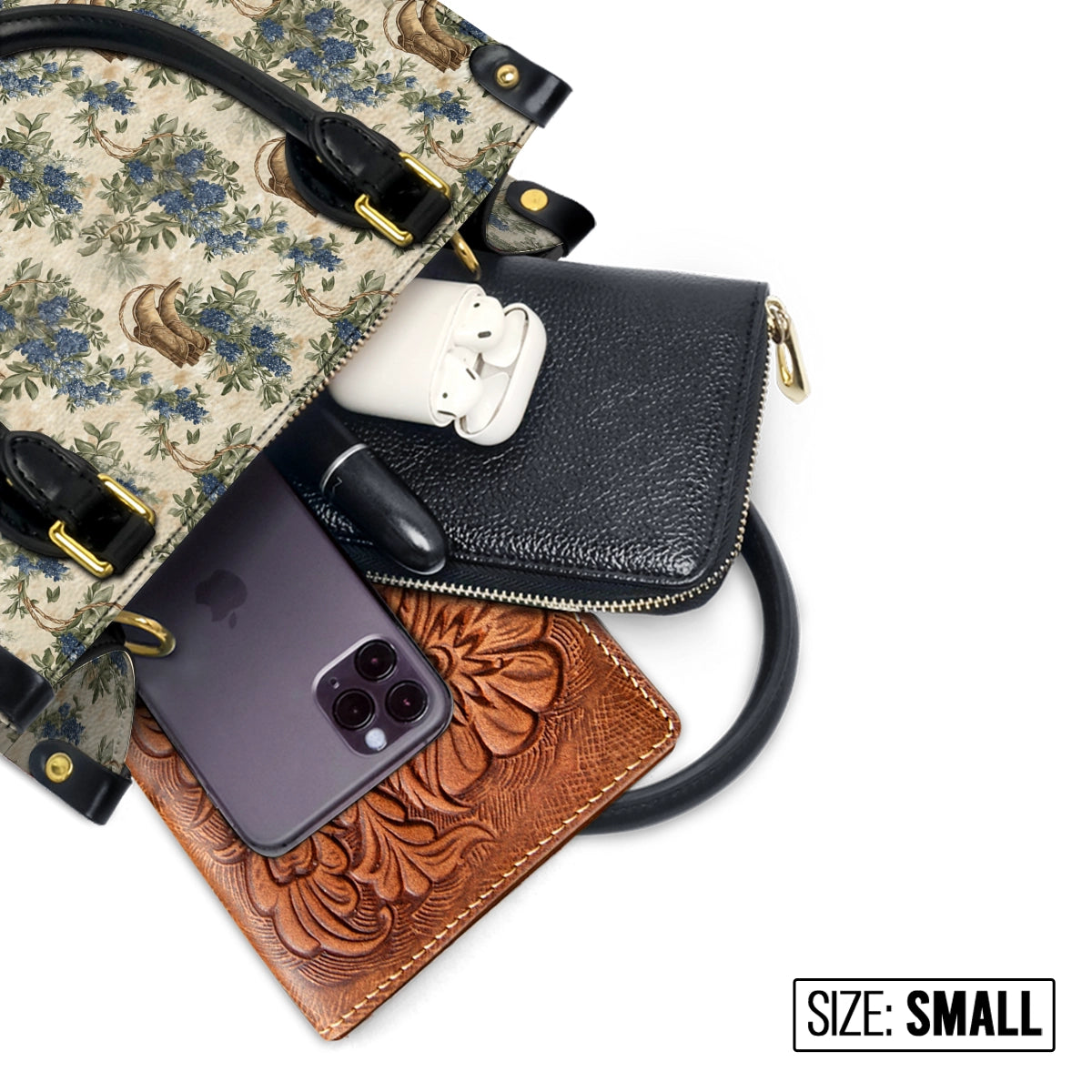 SMALL (9.8" x 7.5" x 4.5"): Don’t be fooled by its compact size — this elegant silhouette fits your daily must-haves: phone, wallet, airpods, sunglasses, a small clutch, and lipstick. Perfect for light travel, casual outings, or a polished dinner look