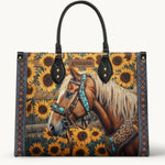 Golden Horse & Sun is a radiant tribute to the bond between beauty and strength. Framed by fields of sunflowers, the golden palomino horse stands tall with turquoise-accented tack and a touch of wild spirit in its leopard-patterned saddle. The vibrant yellow blooms reflect joy and resilience, while the horse symbolizes grace in motion. With tooled leather-inspired borders, this bag blends Western charm with feminine boldness - made for women who shine bright and ride proud.