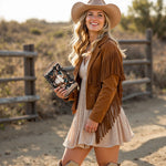 The Floral Longhorn Spirit wallet is where rugged meets refined. A bold longhorn skull blooms with rust, cream, and turquoise florals, framed by cowhide patterns and tribal-styled borders. Compact and powerful, it’s the perfect balance of Western grit and feminine grace. For women who walk with roots deep and style fierce. A pocket-sized celebration of strength and spirit.