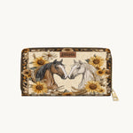 The Golden Horse Harmony wallet celebrates the gentle bond between two noble horses. Framed by sunflowers, wheat, and vintage floral scrolls, their mirrored gaze reflects peace, trust, and unity. Soft cream and golden tones add warmth and elegance to this compact Western keepsake. Designed for women who treasure connection - with nature, with others, and with the untamed soul of the horse. A wallet filled with grace and story.