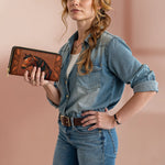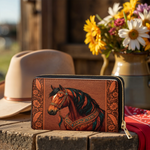 The Regal Horse Bloom wallet radiates Western nobility through every finely drawn detail. With a powerful chestnut horse adorned in turquoise-accented tack and framed by floral tooled leather motifs, it’s a tribute to strength and elegance. Burnt orange and deep teal tones give it a bold, timeless charm. Compact yet dignified, this wallet carries more than essentials - it carries spirit. A regal piece for horse lovers with a fierce heart.