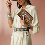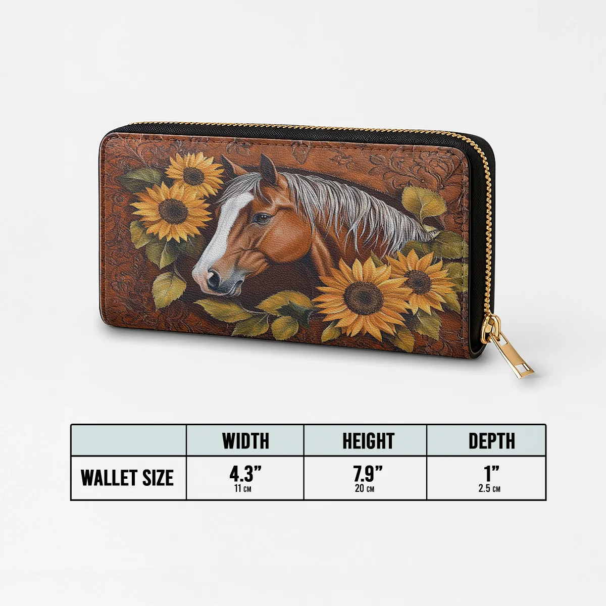 The Sunflower Horse Grace wallet celebrates nature’s harmony - a radiant chestnut horse with a flowing silver mane nestled among blooming sunflowers. Detailed floral embossing in the leather backdrop evokes handcrafted artistry. Warm earthy tones and golden petals reflect a spirit of calm strength. This wallet is perfect for women who love horses, sunshine, and quiet confidence.