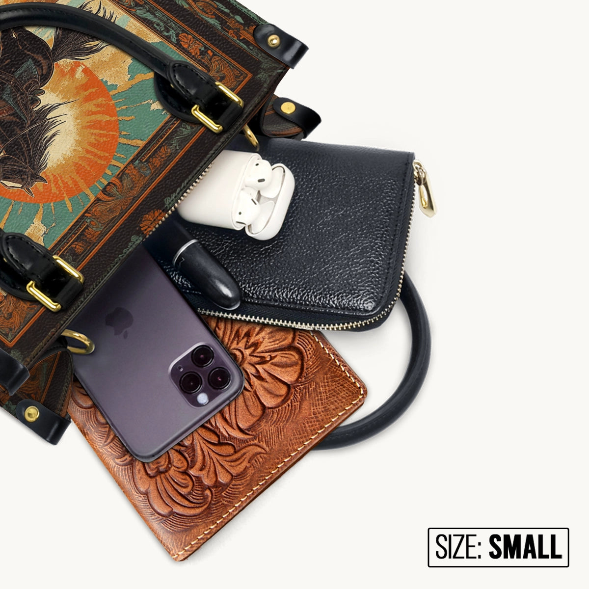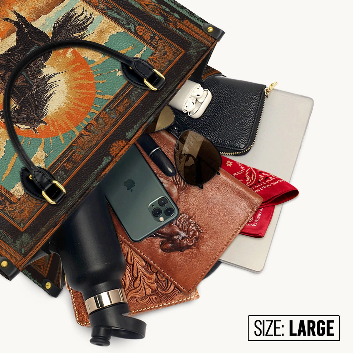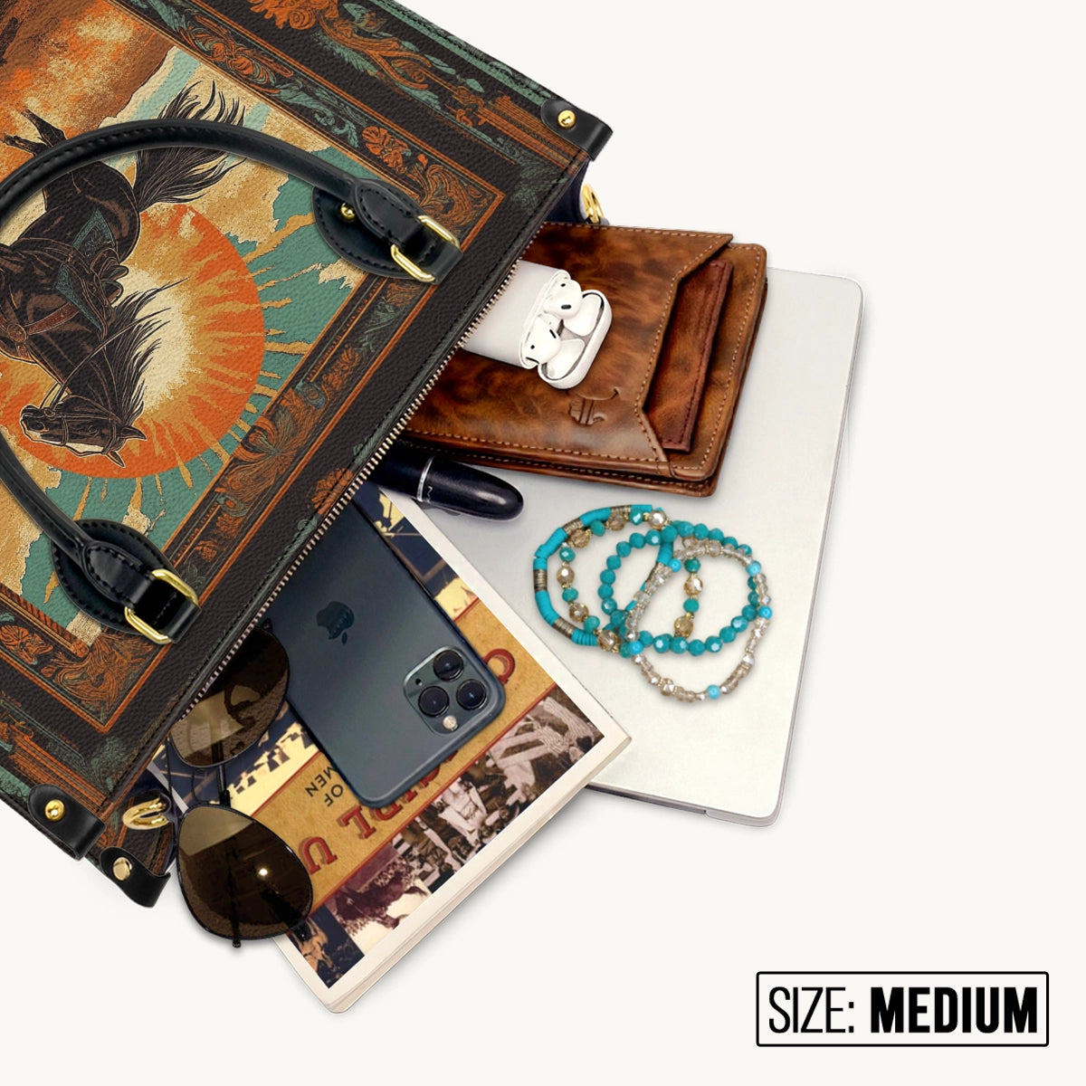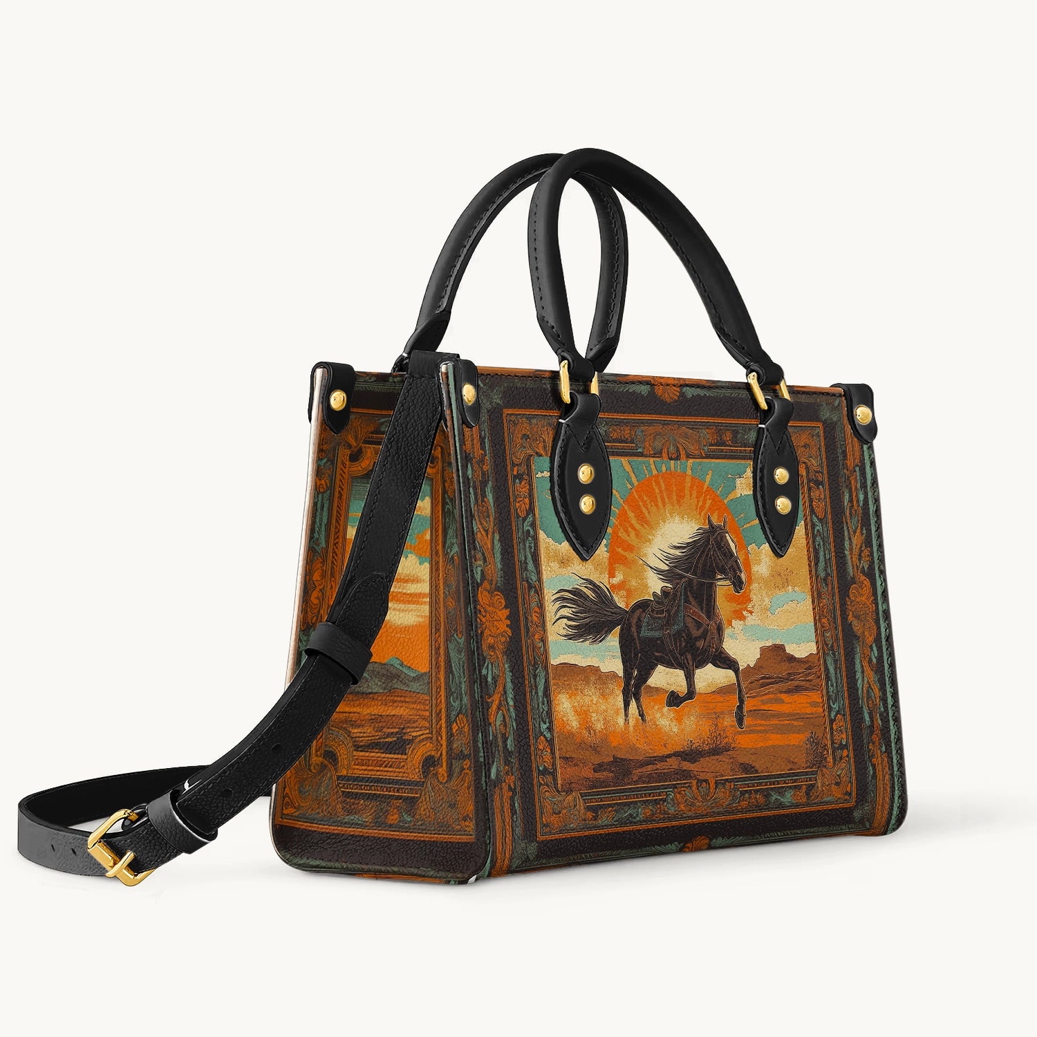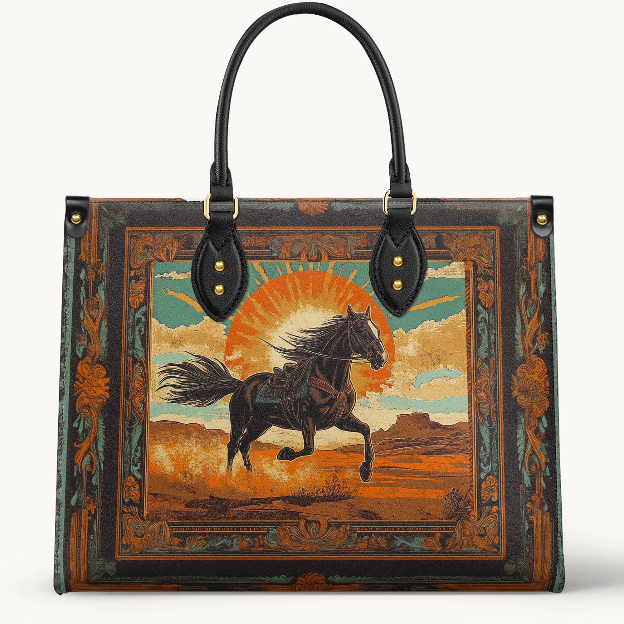 Desert Storm Horse gallops through the heart of the wild - a powerful symbol of untamed freedom and firelit strength. Set against a blazing Western sunset, the black stallion surges forward, kicking up dust beneath a sky streaked with gold and turquoise. Ornate vintage borders frame the scene like a painting of rebellion and grace. This bag is made for women who carry the West in their soul and never let the winds tame their stride.