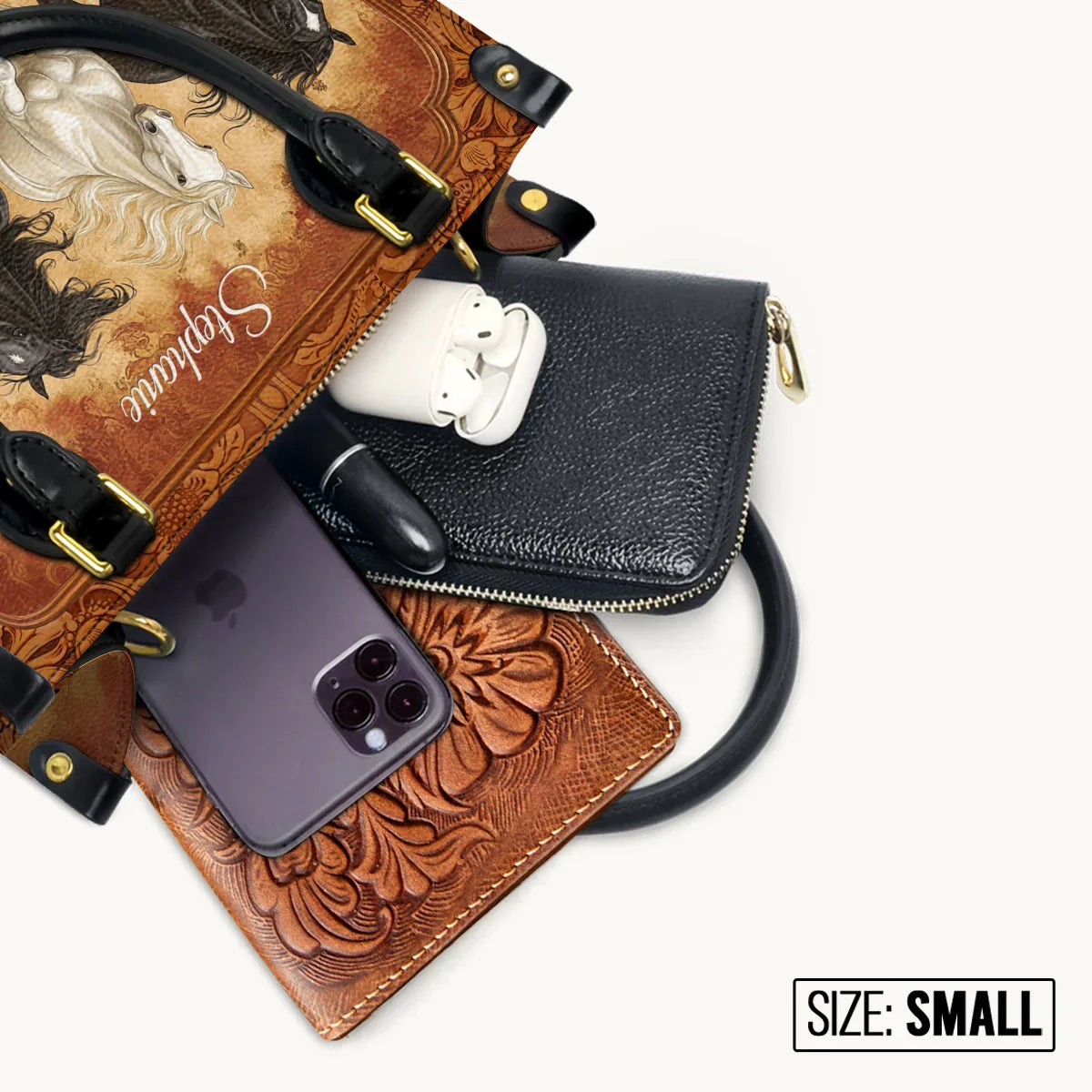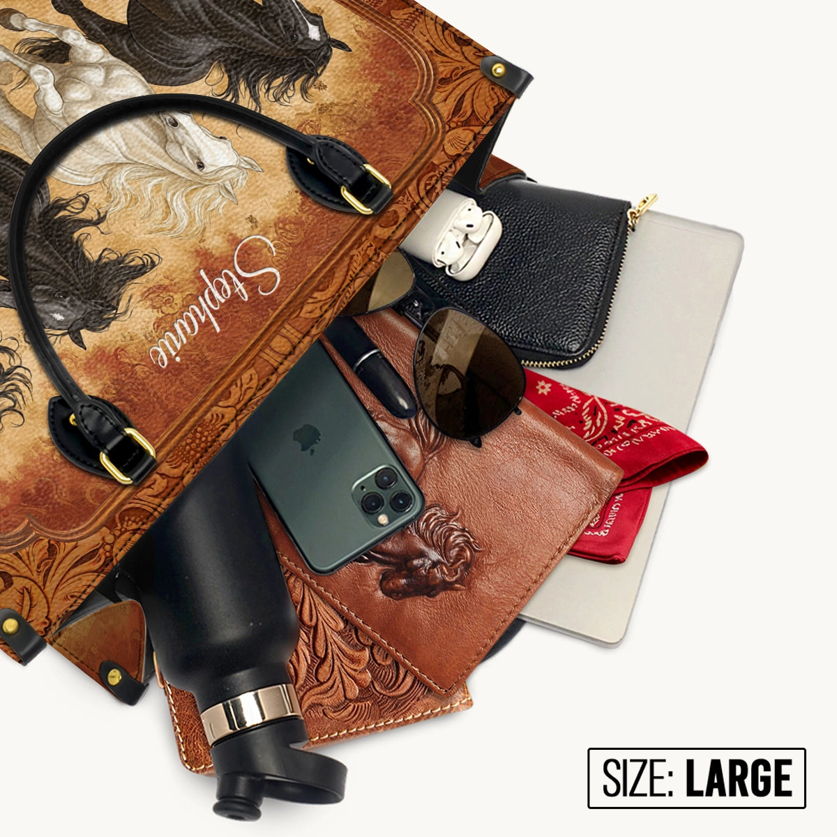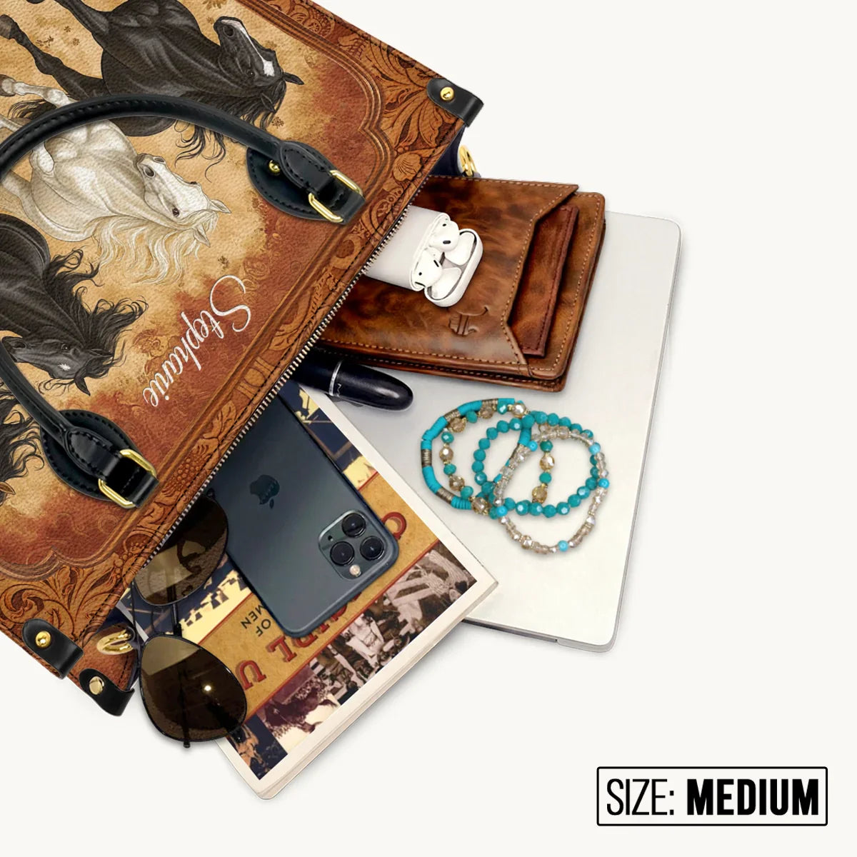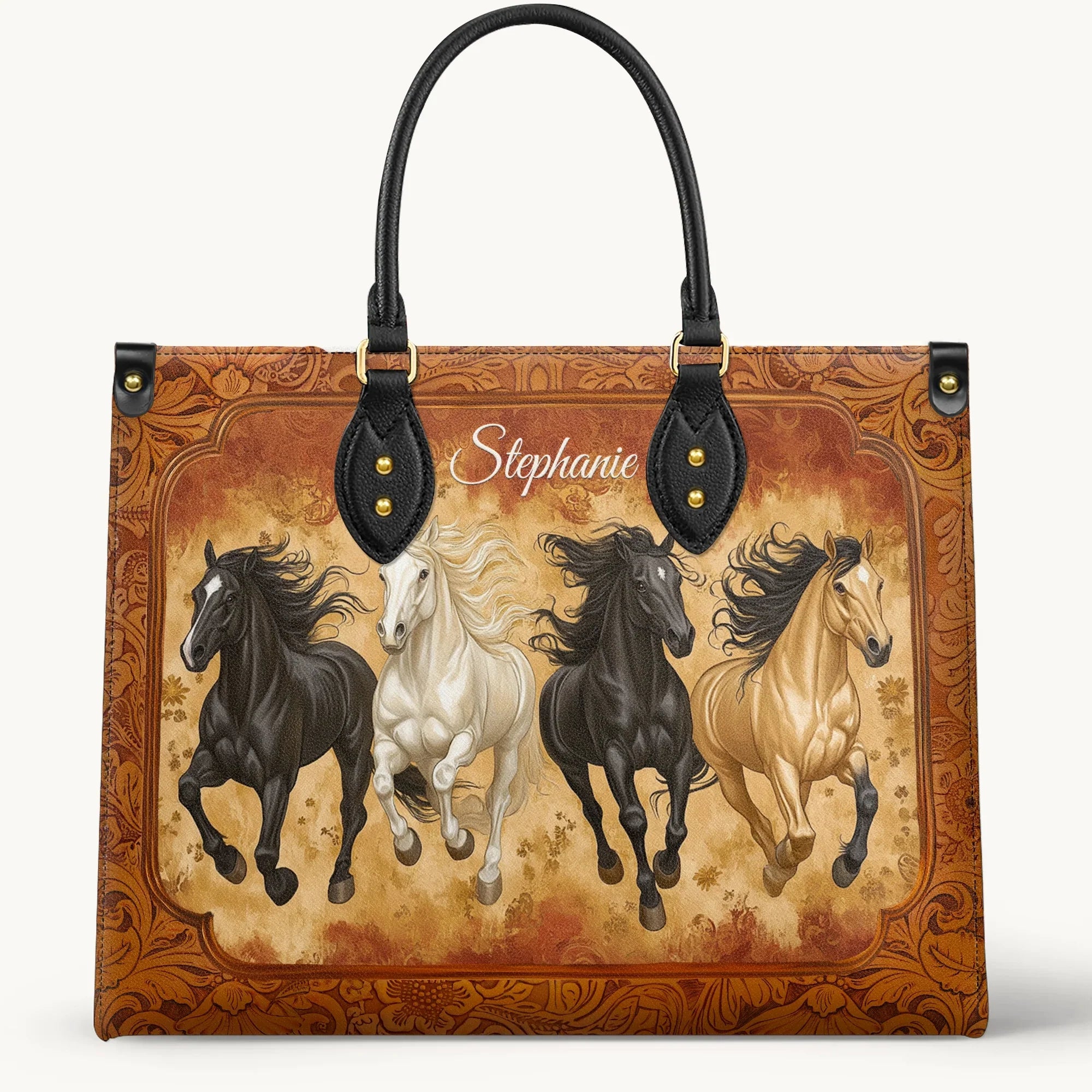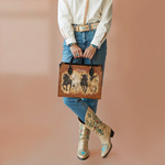 Galloping Horse Legacy celebrates the fierce beauty of freedom in motion. Four majestic horses - in shades of black, white, and gold - charge across a warm Western backdrop, framed by tooled leather-inspired borders. Each stride echoes power, unity, and untamed spirit, making this design a tribute to the wild heart of the West. For women who ride through life with strength, grace, and a soul that can’t be broken.