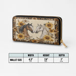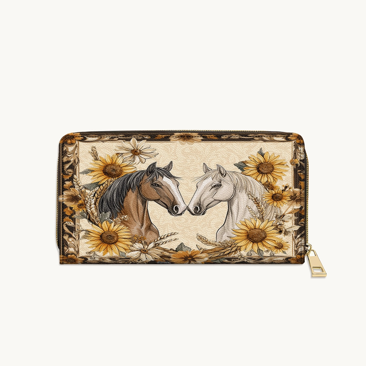 The Golden Horse Harmony wallet celebrates the gentle bond between two noble horses. Framed by sunflowers, wheat, and vintage floral scrolls, their mirrored gaze reflects peace, trust, and unity. Soft cream and golden tones add warmth and elegance to this compact Western keepsake. Designed for women who treasure connection - with nature, with others, and with the untamed soul of the horse. A wallet filled with grace and story.