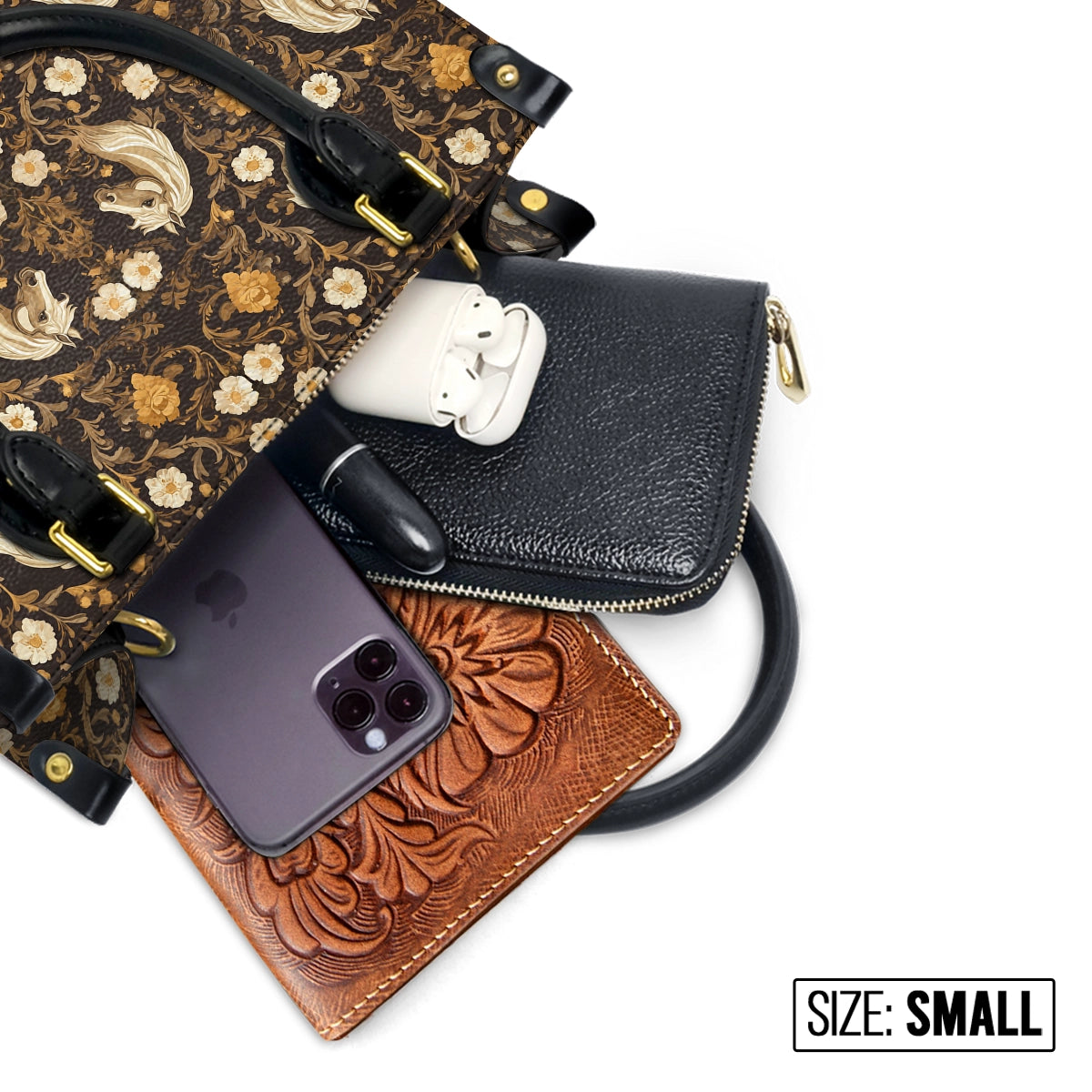 SMALL (9.8" x 7.5" x 4.5"): Don’t be fooled by its compact size — this elegant silhouette fits your daily must-haves: phone, wallet, airpods, sunglasses, a small clutch, and lipstick. Perfect for light travel, casual outings, or a polished dinner look