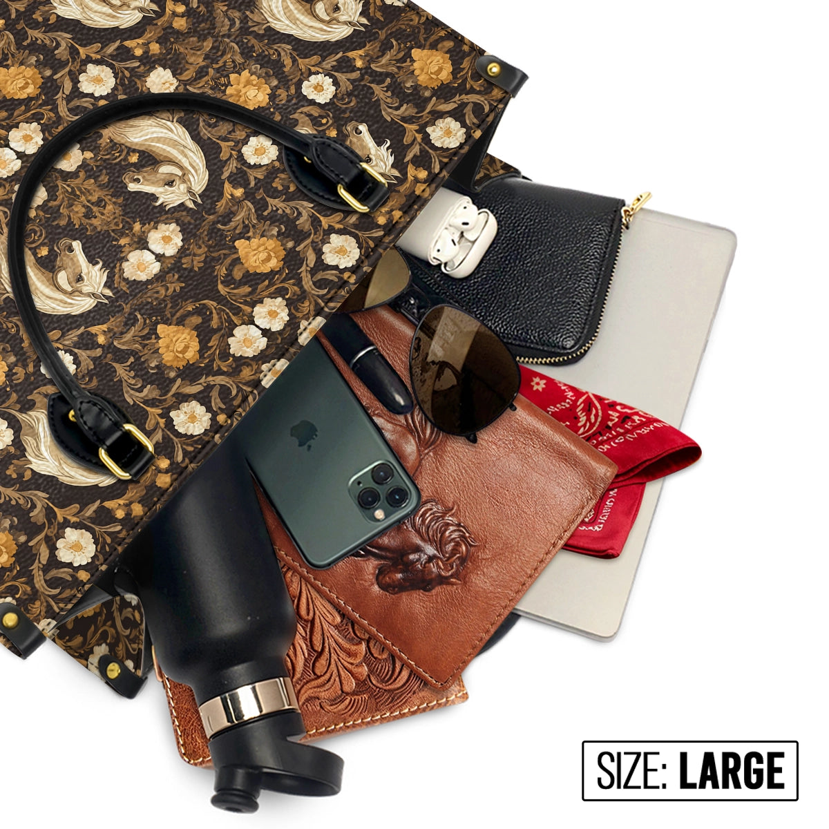 Golden-maned horses gallop through a backdrop of vintage florals and tooled-leather elegance — a design born from the untamed beauty of the West. Each detail echoes the rhythm of hooves on dusty trails, the scent of worn saddles, and the quiet strength of women who walk boldly and bloom wild.