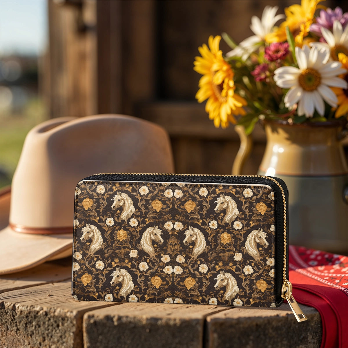 Golden-maned horses gallop through a backdrop of vintage florals and tooled-leather elegance — a design born from the untamed beauty of the West. Each detail echoes the rhythm of hooves on dusty trails, the scent of worn saddles, and the quiet strength of women who walk boldly and bloom wild.