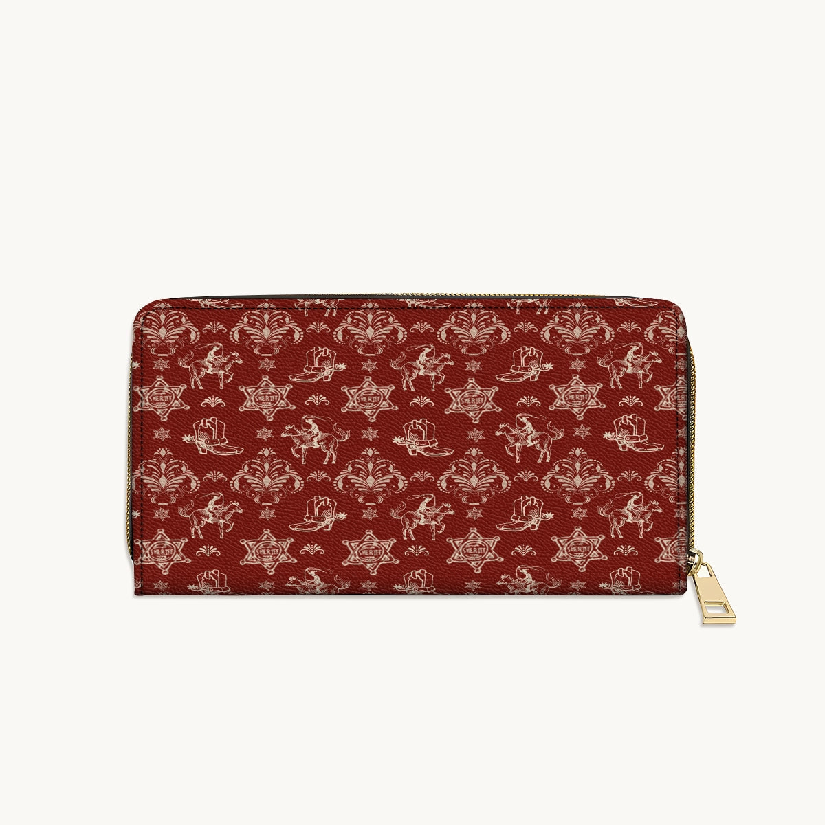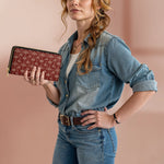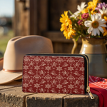 The Rodeo Rouge wallet brings timeless cowgirl charm in a bold, refined pattern. Deep red leather sets the stage for dancing horses, sheriff badges, cowboy boots, and floral scrolls - all etched in soft ivory for an elegant Western contrast. Classic yet playful, it's the perfect blend of grit and grace. A compact statement piece for women proud of their Western roots. Tradition reimagined in every stitch.