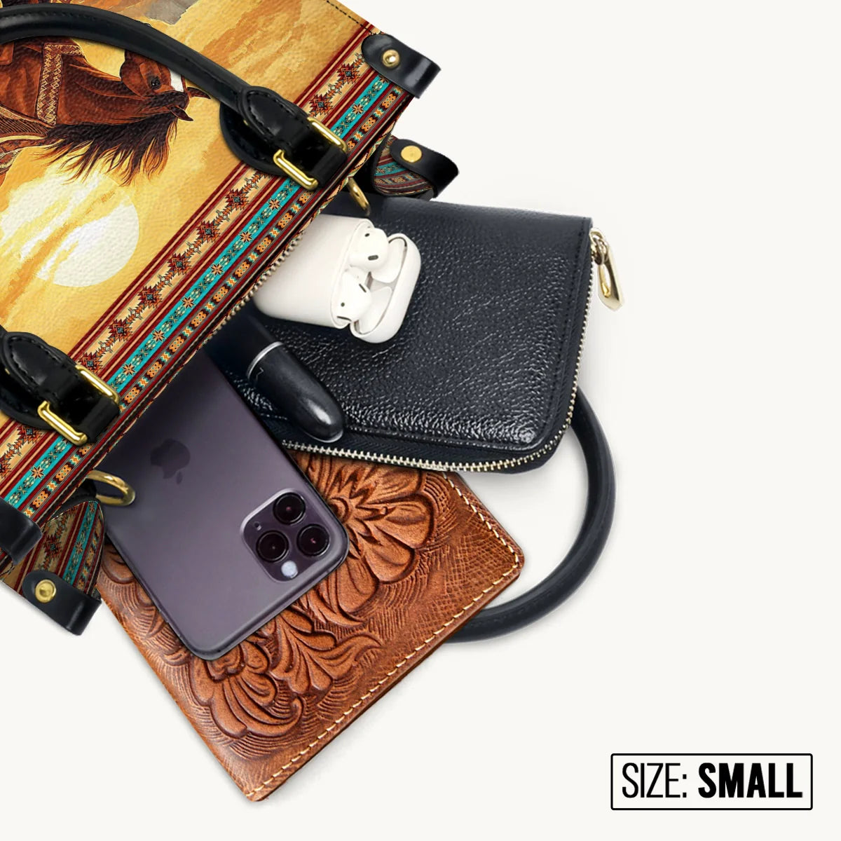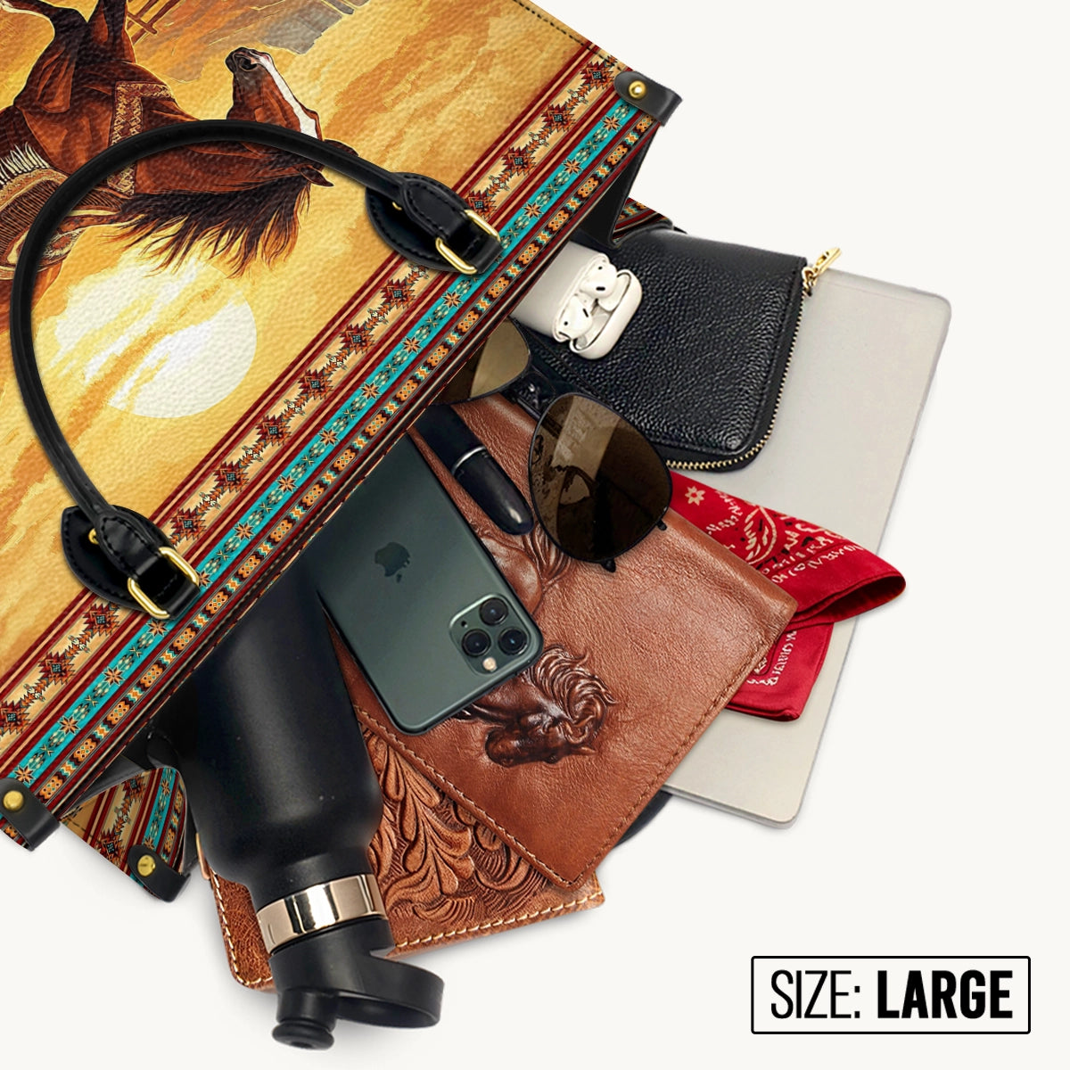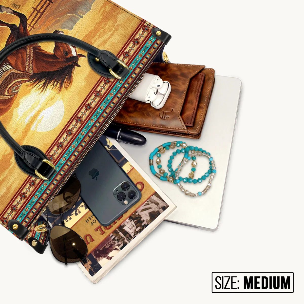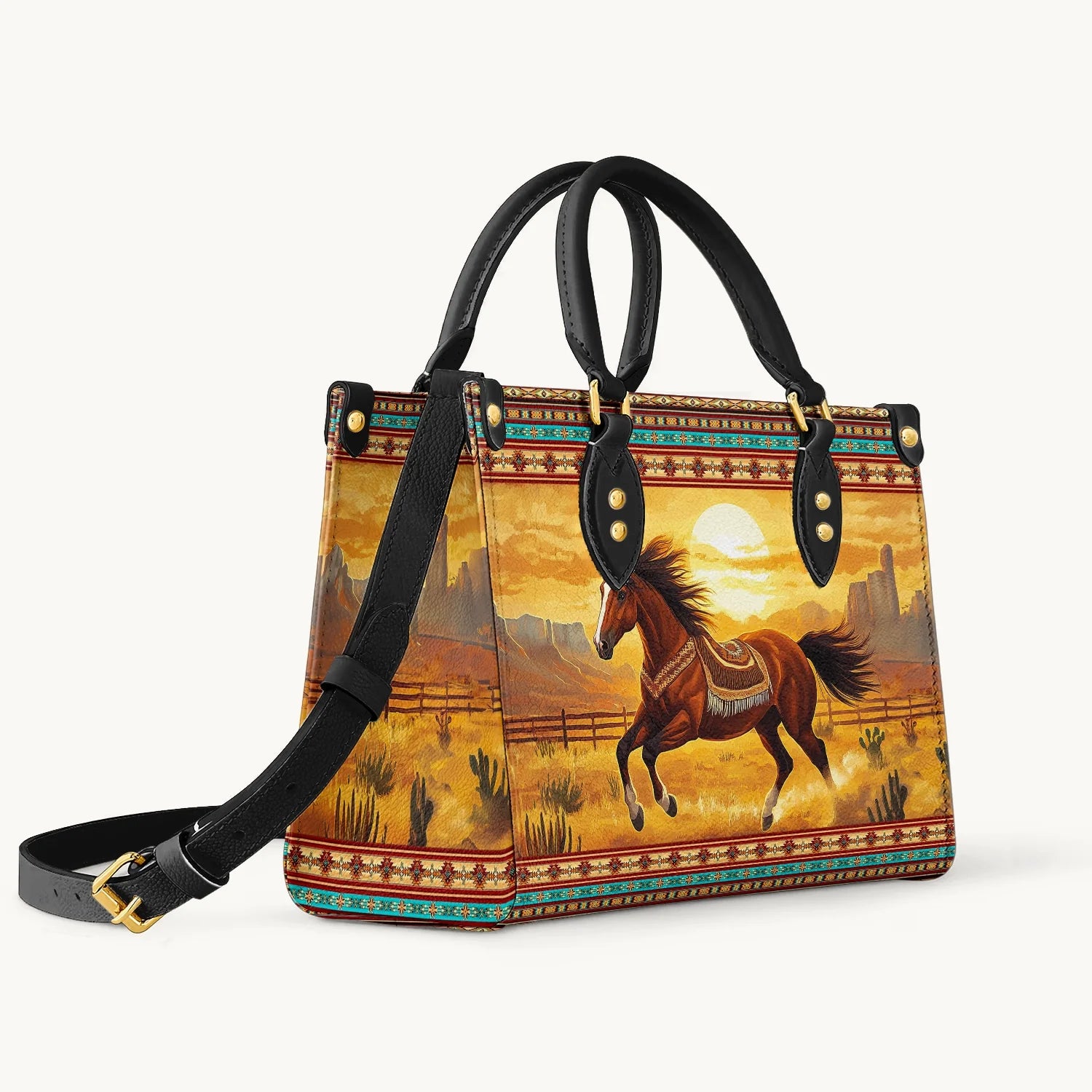 Spirit Horse captures the soul of the wild West - where golden fields meet open skies, and freedom runs on four hooves. The powerful steed galloping beneath the sun symbolizes strength, independence, and unshaken will. Wrapped in tribal border patterns, the design honors Western heritage and sacred connection to the land. It’s a bag made for women who lead with grace, ride with purpose, and carry the untamed spirit within.