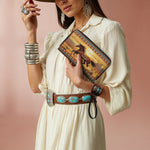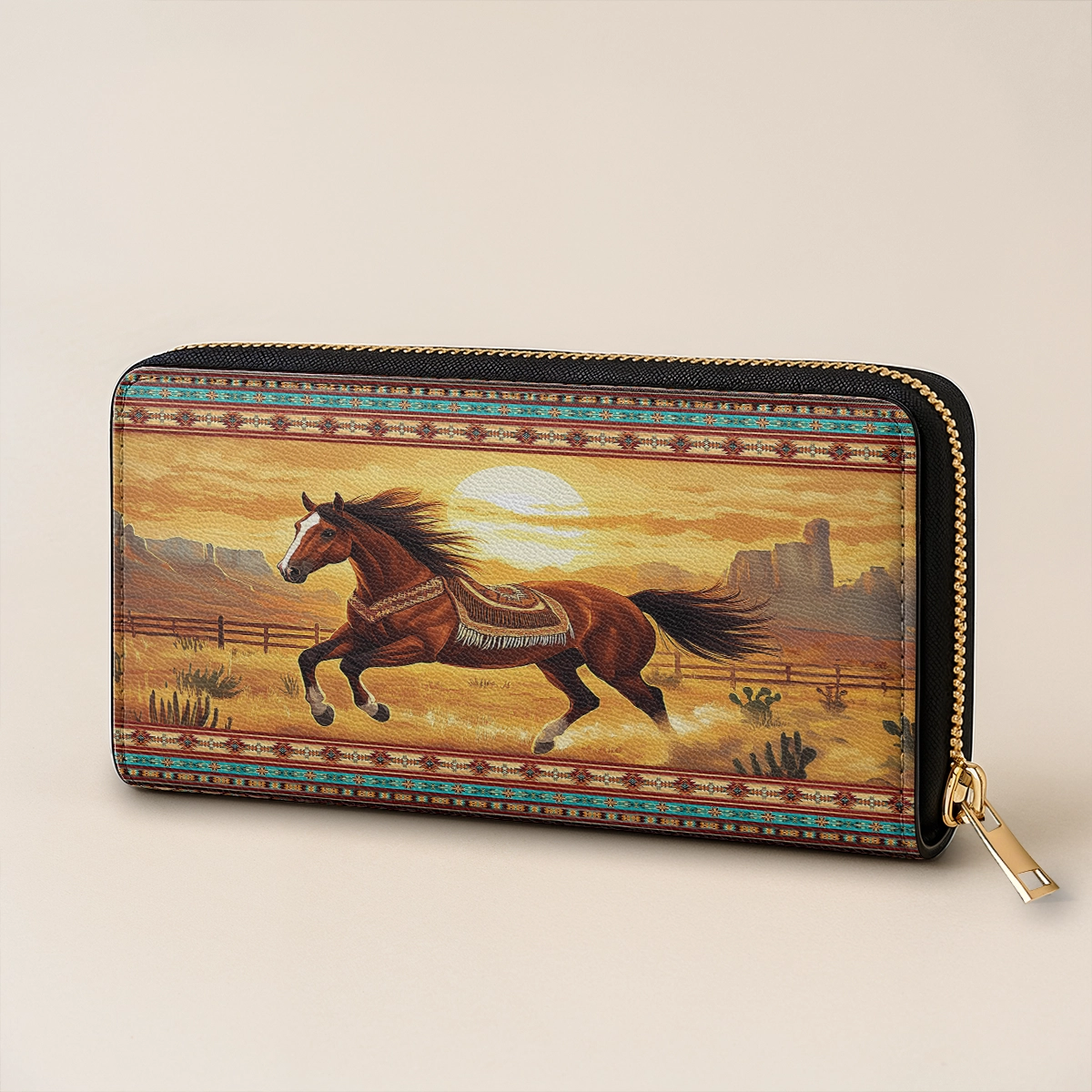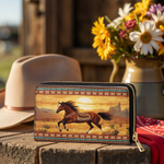 The Spirit Horse wallet captures the thrill of freedom beneath a golden sky. A spirited bay horse runs wild through the sunlit plains, adorned with a Western-style saddle blanket. Surrounded by terracotta borders and tribal patterns, it echoes the warmth and wonder of dusk on the range. This wallet is for the bold-hearted - women who carry fire and grace with every step.