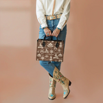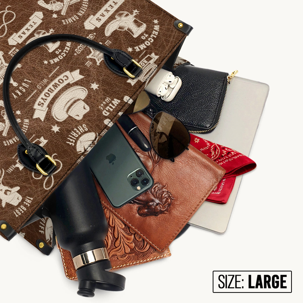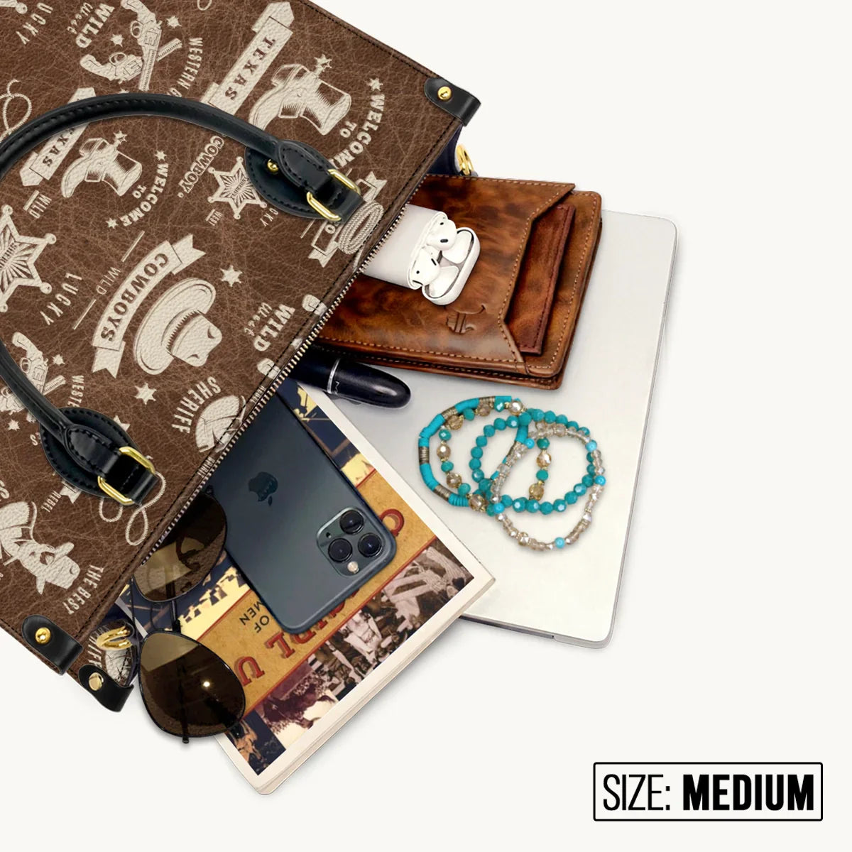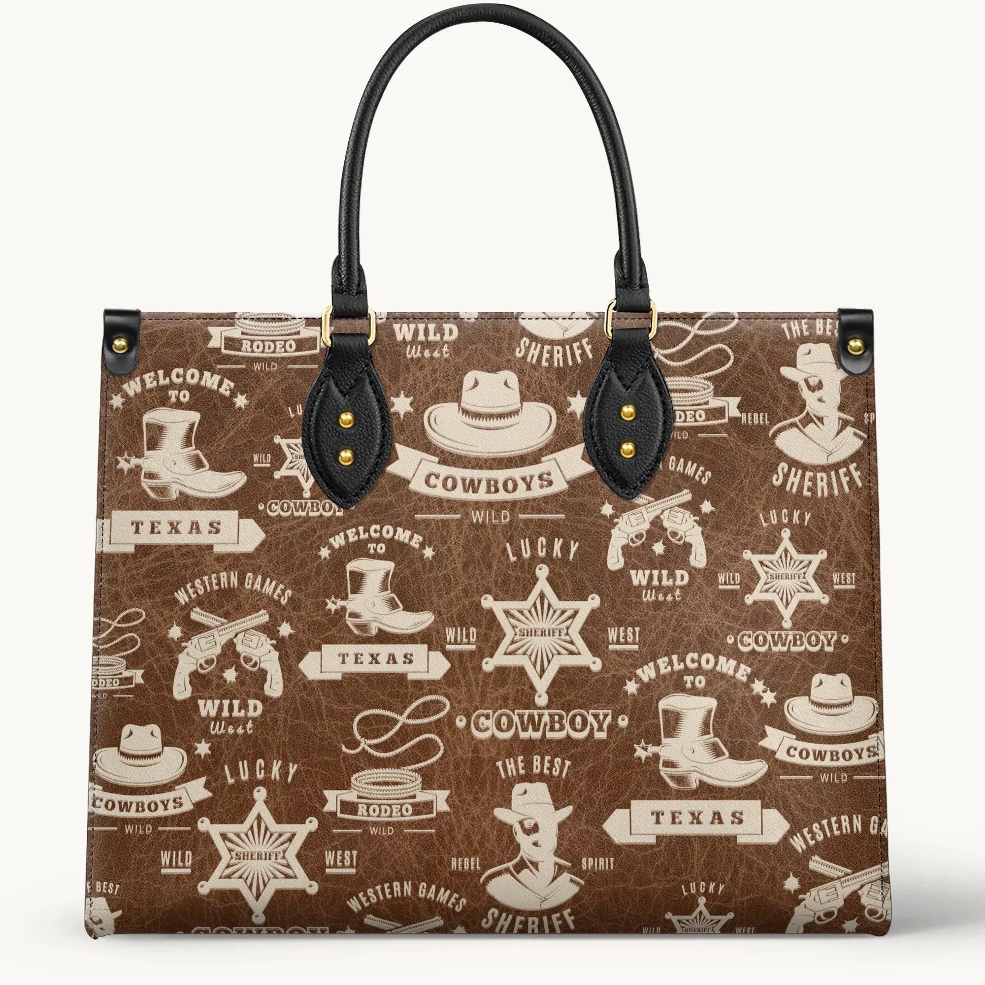 Cowboy Heritage brings the wild spirit of the West to life in a bold, vintage-inspired design. Featuring a collage of classic Western icons - from sheriff badges and rodeo hats to boots, lassos, and stars - this bag captures the essence of Texas pride and cowboy grit. The distressed leather-look background adds depth and character, giving it that rugged, timeless feel. Perfect for women who celebrate Western legacy with strength, style, and a hint of rebellion.
