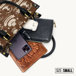 SMALL (9.8" x 7.5" x 4.5"): Don’t be fooled by its compact size — this elegant silhouette fits your daily must-haves: phone, wallet, airpods, sunglasses, a small clutch, and lipstick. Perfect for light travel, casual outings, or a polished dinner look