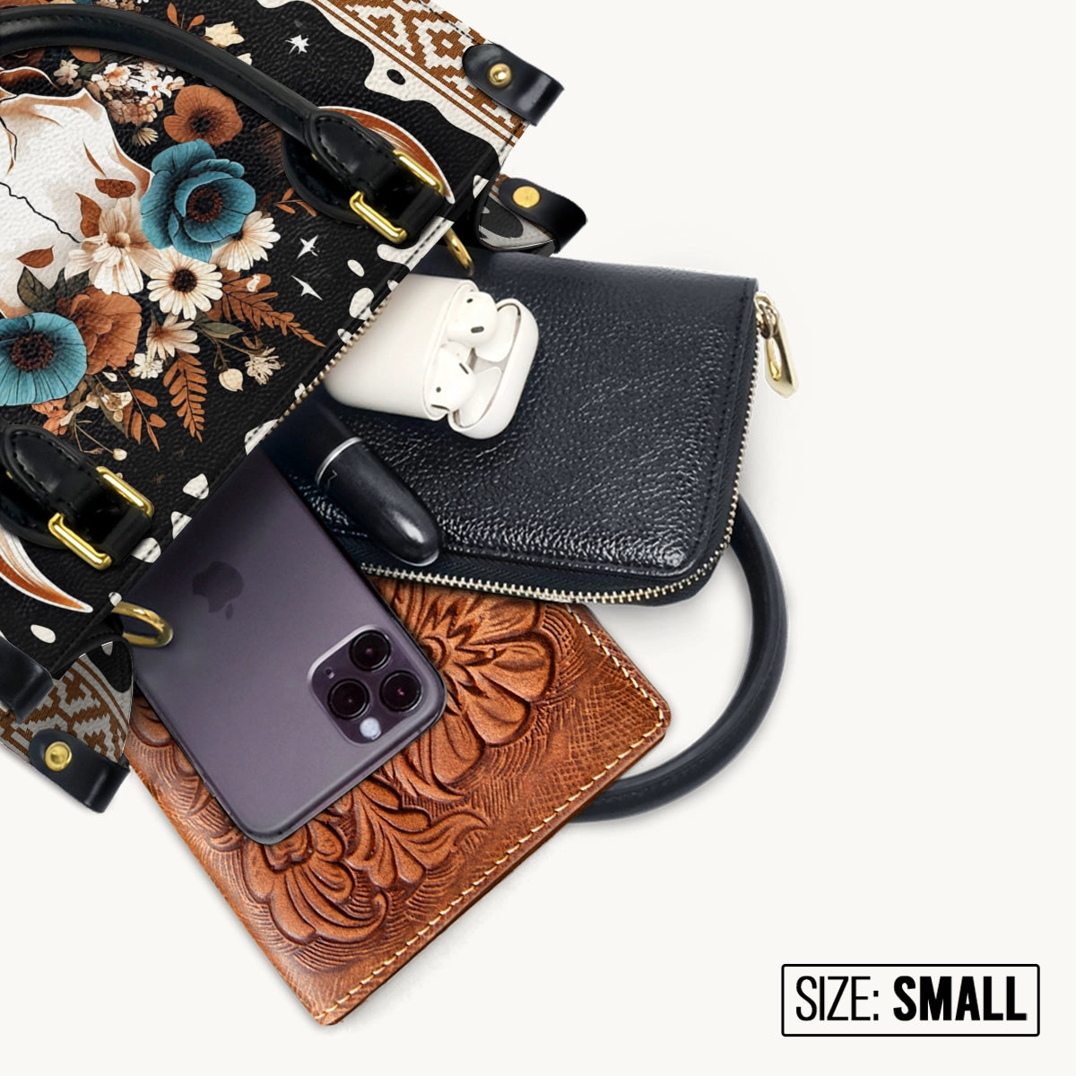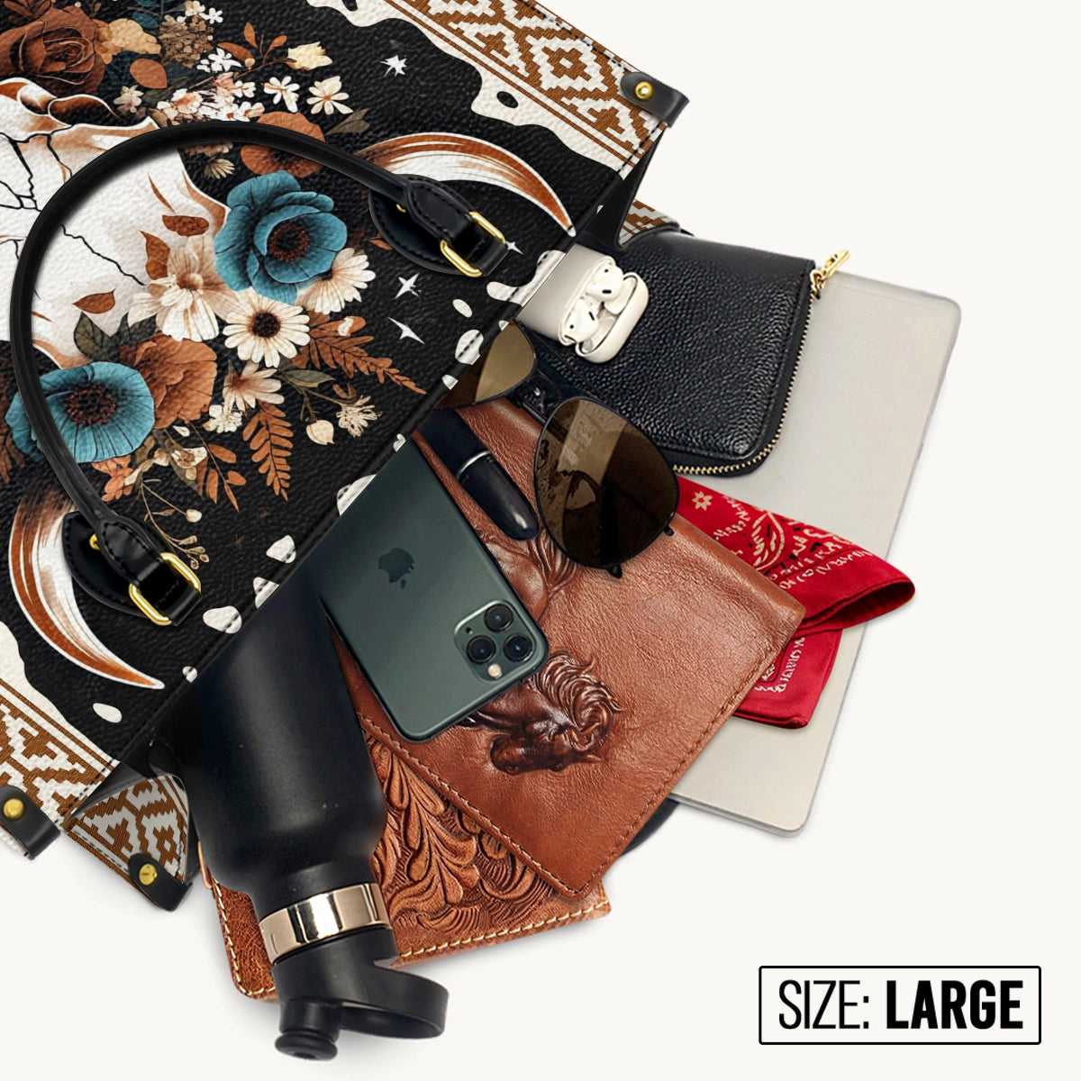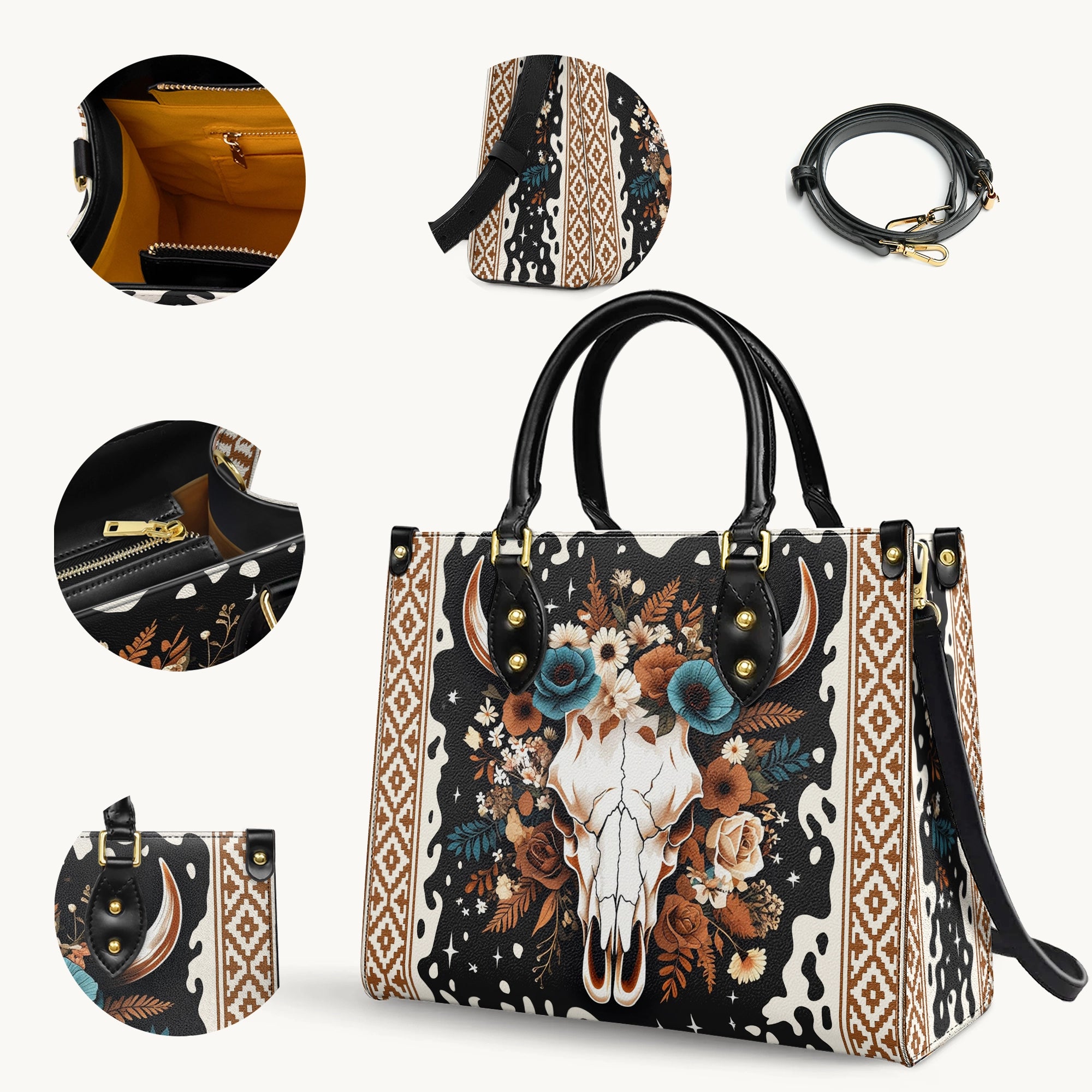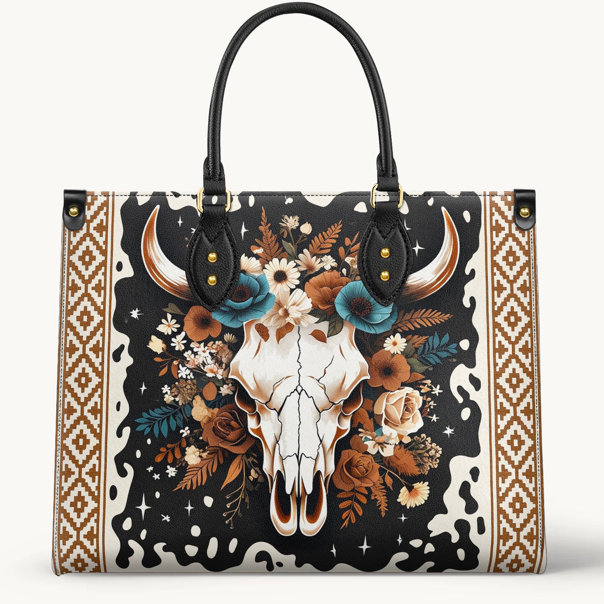 Floral Longhorn Spirit blends strength and softness in a striking Western statement. At its heart, a detailed longhorn skull is crowned with blooms - turquoise, rust, cream, and sienna - symbolizing resilience rising through the wild. The bold cow-print edges and tribal-inspired borders give the design its grounded power, while the floral wreath softens it with feminine grace. This bag speaks to the women who honor both the grit and beauty of their roots - wild, wise, and unapologetically bold.
