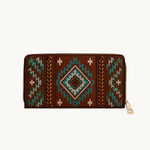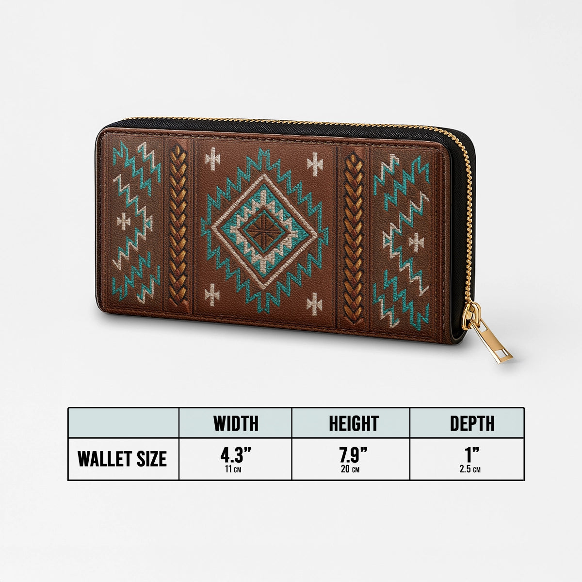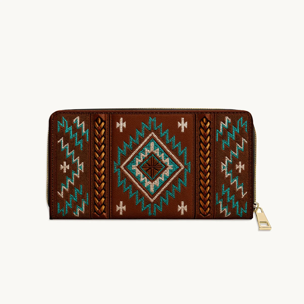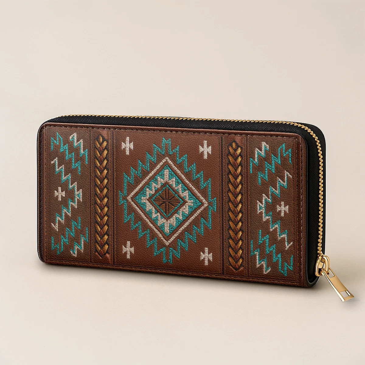 Sundance Echo is inspired by the enduring spirit of Western women - bold, graceful, and deeply rooted in heritage. The diamond centerpiece symbolizes vision and protection, guiding her through life’s wild terrain. Lightning-like turquoise patterns reflect her untamed energy and quiet strength. Braided leather details nod to the timeless image of a cowgirl’s braid - soft yet unyielding. Every motif is a tribute to generations who shaped the West with resilience and heart. This wallet doesn’t just carry essentials - it carries a legacy.