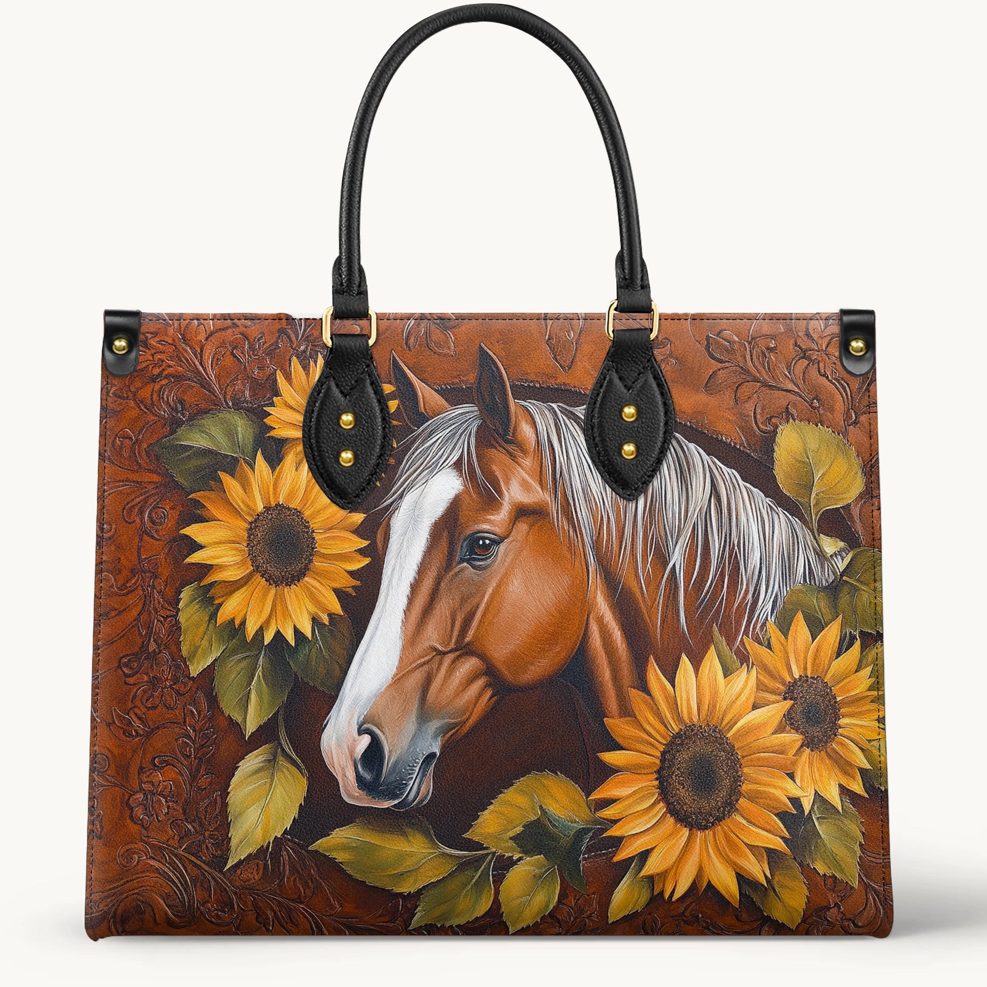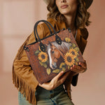 Sunflower Horse Grace is a warm-hearted tribute to the gentle strength of the Western spirit. At the center, a golden horse with a soft gaze rests among blooming sunflowers and tooled leather floral patterns - blending rustic charm with quiet beauty. The rich caramel and earthy tones echo the spirit of sunlit fields and soft hoofbeats on dusty trails. This bag is made for women who walk with grace, carry nature in their hearts, and find peace in every sunrise.