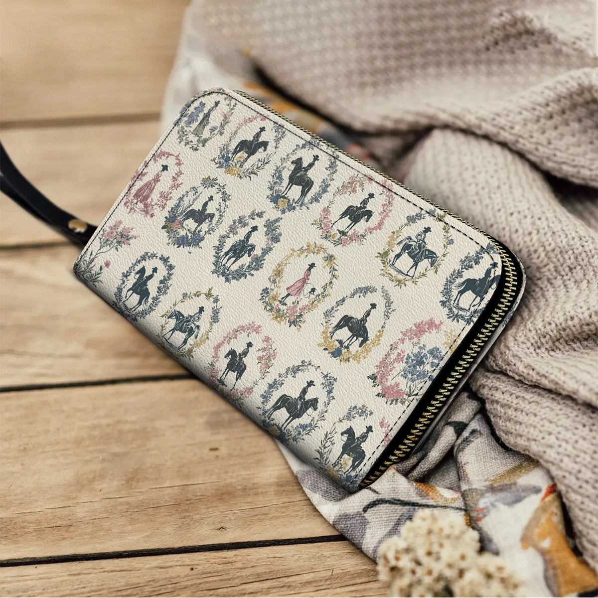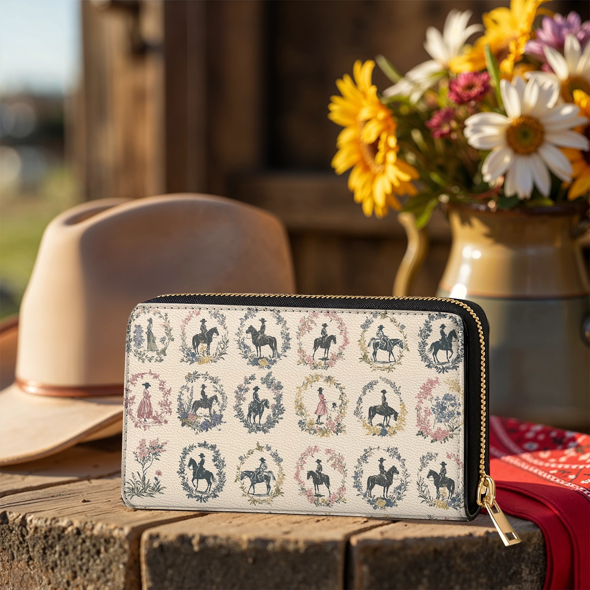 Timeless silhouettes of riders and prairie women bloom within delicate wreaths — each frame a whispered memory from the heart of the West. Set against a parchment-hued canvas, the artwork nods to heirloom linens, wildflower fields, and stories passed down at golden hour.